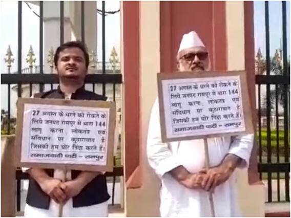इसी क्रम में आज सपा नेता आसिम राजा, सपा के जिला अध्यक्ष वीरेंद्र गोयल, विधायक नसीर खान और आजम खान के बेटे अब्दुल्ला आजम हाथों में तख्ती लेकर रामपुर के गांधी समाधि पहुंचे. सपा नेताओं की तख्ती पर लिखा था, '27 अगस्त के धरने को रोकने के लिए जनपद रामपुर में धारा 144 लागू करना लोकतंत्र एवं सविधान पर कुठाराघात है जिसकी हम घोऱ निंदा करते हैं.' मौके पर मौजूद सपा नेताओं का कहना था कि प्रदर्शन करना उनका लोकतांत्रिक अधिकार है.