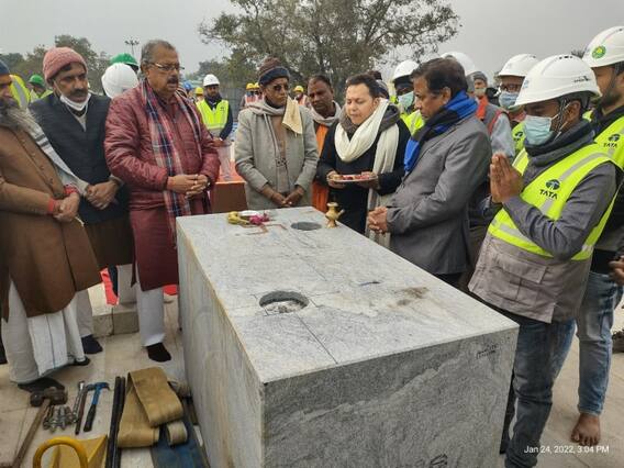 Ram Mandir Ayodhya: राम जन्मभूमि परिसर में प्लिंथ के निर्माण के पहले वैदिक ब्राह्मण के मौजूदगी में निर्माणाधीन स्थल पर ट्रस्ट के महासचिव चंपत राय ने ट्रस्ट के सदस्य तथा कार्यदाई संस्था के इंजीनियरों के साथ पूजन अर्चन किया. इससे पहले मंदिर की बुनियाद के बाद राफ्ट के ढलाई का काम पूरा हुआ अब प्लिंथ का निर्माण का कार्य शुरू हुआ है. राफ्ट के ऊपर बलुआ पत्थर और ग्रेनाइट पत्थरों से 20 फीट ऊंचा प्लिंथ का निर्माण किया जाएगा और उसके ऊपर मन्दिर निर्माण के लिये कार्यशाला में तराश कर रखे गए पत्थरों से मंदिर का निर्माण होगा. प्लिंथ निर्माण में लगभग 6 महीने का समय लगेगा.