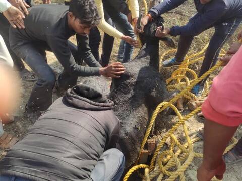 मीठापुर गांव के बाहर बने कुएं में एक गाय घास चरती हुई गिर गई. कुआं काफी गहरा था इसीलिए गांववालों की कड़ मशक्कत के बाद भी गाय को बाहर नहीं निकाला जा सका. गांववालों ने रेस्क्यू के लिए डायल 112 न फायर विभाग को सूचना दी. फायर विभाग की टीम मौके पर पहुंची और कड़ी मशक्कत के बाद गाय को बाहर निकाला जा सका. फायर टीम के प्रभारी आनंद सिंह पूरी टीम के साथ मौके पर पहुंचे थे.