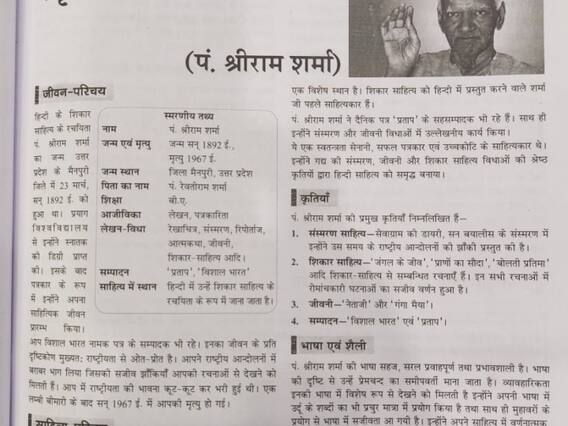 लेख से पहले श्रीराम शर्मा की जीवनी भी प्रकाशित की गई है. शर्मा की जीवनी पेज नंबर 55 से शुरू होती है. जीवनी तो फ़िरोज़ाबाद के रहने वाले लेखक श्रीराम शर्मा की है, लेकिन लापरवाही की वजह से तस्वीर गायत्री परिवार के संस्थापक पंडित श्रीराम शर्मा आचार्य की लगाई गई है.