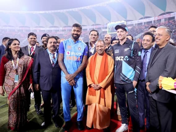 IND vs NZ: उत्तर प्रदेश के सीएम योगी आदित्यनाथ (Yogi Adityanath) भारत और न्यूजीलैंड के बीच खेले जा रहे दूसरे टी-20 मैच को देखने के लिए लखनऊ स्थित इकाना स्टेडियम पहुंचे. यहां उन्होंने भारतीय टीम की हौसला अफजाई की और उन्होंने क्रिकेटरों के साथ फोटो भी क्लिक कराई. भारत और न्यूजीलैंड के बीच टी20 सीरीज का दूसरा मैच लखनऊ के इकाना स्टेडियम में खेला जा रहा है, इस मैच में न्यूजीलैंड की टीम ने टॉस जीतकर बल्लेबाजी चुनी है. यह तीन मैचों की सीरीज है जिसका पहला मैच न्यूजीलैंड ने जीता है.