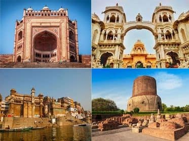 यूपी सरकार की पर्यटन विभाग की आधिकारिक वेबसाइट के अनुसार, आगरा का फतेहपुर सीकरी, मथुरा, वृन्दावन, लखनऊ, वाराणसी का सारनाथ, अयोध्या, कुशीनगर, श्रावस्ती, कपिलवस्तु, प्रयागराज, चित्रकूट, बरेली, झांसी, मेरठ और सरधना मुख्य पर्यटन स्थल हैं.