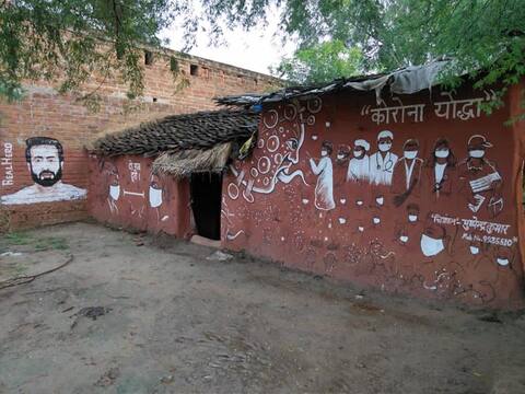 यूपी के जनपद जालौन के एक युवा चित्रकार पुष्पेंद्र कुमार राज ने सोनू सूद से प्रभावित होकर उन्हें रियल कोरोना वॉरियर बताया, साथ ही उनकी फोटो उसने गांव और घर की दीवारों पर उकेर दी. कहते हैं, होनहार लोगों का कोई अलग देश स्थान या गांव नहीं होता और ना ही उसे किसी अत्याधुनिक उपकरणों की आवश्यकता होती है. मन में दृढ़ता और कुछ कर गुजरने की इच्छा हो तो वह कुछ भी कर सकता है. पुष्पेंद्र ने अपने हुनर का प्रदर्शन करते हुए अपने ही गांव की दीवारों पर कुछ घरेलू सामग्रियों के साथ कोरोना योद्धाओं की तस्वीर को उकेर दिया.