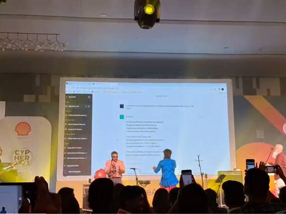 दरअसल, साइफर 2023 इवेंट में बेंगलुरु के बैंड ग्रुप, स्वरात्मा ने चैट जीपीटी को एक स्पेसिफिक कमांड दी. बैंड ग्रुप ने चैट जीपीटी से 8 लाइन का कोरस AI कॉन्फ्रेंस में फ्रंट पर रेड ड्रेस में बैठी महिला पर लिखने के लिए कहा. इसके जवाब में चैटबॉट ने 8 लाइन का गाना लिखा और फिर बंद ग्रुप ने उसे गया. सोशल मीडिया पर जैसे ही ये वीडियो अपलोड हुआ ये वायरल होने लगा. टेक्नोलॉजी के इस अद्भुत कमाल को देखकर लोग सोशल मीडिया पर अलग-अलग तरह के रिएक्शन भी देख रहे दे रहे हैं. एक यूजर ने लिखा कि AI को गाना भी खुद ही गाना चाहिए.