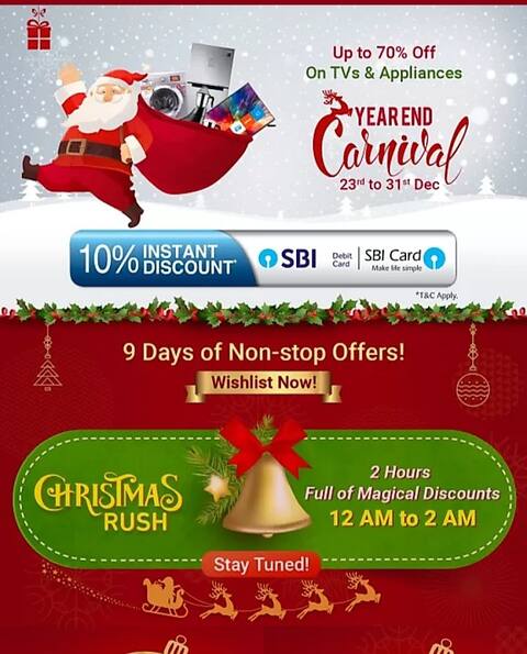 नई दिल्ली: वॉलमार्ट अधिकृत फ्लिपकार्ट ने इयर एंड सेल का एलान कर दिया है जहां टीवी और अप्लायंस पर यूजर्स को 70 प्रतिशत तक छूट मिल सकती है. इयर एंड कार्निवल वाले इस सेल का आयोजन कुल 9 दिनों तक किया जाएगा. जहां इसकी शुरूआत कल से यानी की 23 दिसंबर से हो चुकी है. सेल 31 दिसंबर तक चलेगी. कंपनी ने इस सेल के लिए SBI के साथ पार्टनरशिप किया है जहां डेबिट कार्ड यूजर्स को 10 प्रतिशत की अतिरिक्त छूट मलेगी.