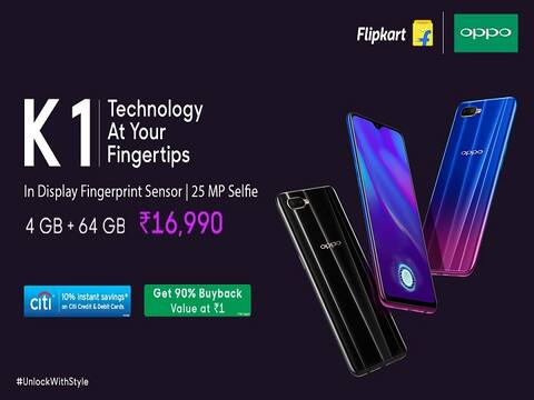 ओप्पो K1 को भारत में दो वेरिएंट के साथ लॉन्च किया गया है. बेस वेरिएंट 64 जीबी स्टोरेज और 4 जीबी रैम के साथ आता है. इसकी कीमत 16,990 रुपये है. ये फोन भारत में फिलहाल सबसे सस्ता फोन है जो इन डिस्प्ले फिंगरप्रिंट सेंसर के साथ आता है. ओप्पो का ये नया स्मार्टफोन फिल्पकार्ट पर उपलब्ध होगा और सेल की शुरूआत 12 फरवरी 2019 से होगी. यूजर्स को इस दौरान लॉन्च ऑफर्स भी मिलेगा जिसमें नो कॉस्ट ईएमआई और फ्लिपकार्ट की बायबैक गैरेंटी को शामिल किया गया है जो आपको 1 रुपये में 90 प्रतिशत का बायबैक देगा. फोन के साथ मोबाइल प्रोटेक्शन की भी सुविधा दी जाएगी.