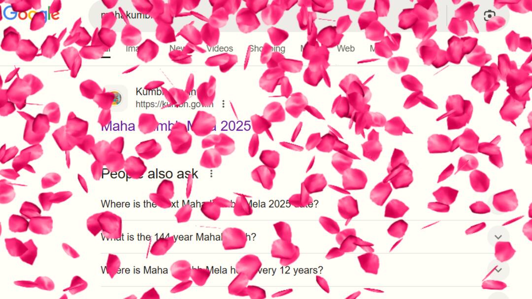 गूगल पर महाकुंभ सर्च करने पर स्क्रीन पर गुलाबों की पंखुड़ियां गिरने वाला एनिमेशन दिख रहा है. इसका आनंद लेने के लिए अपने मोबाइल या डेस्कटॉप पर गूगल सर्च को ओपन करना होगा. इसके बाद यहां हिंदी या इंग्लिश में महाकुंभ लिखें. अब जैसे ही आप सर्च पर क्लिक या टैप करेंगे, सर्च रिजल्ट के साथ ही स्क्रीन पर गुलाब की पंखुड़ियां गिरने वाला एनिमेशन चलने लगेगा.
