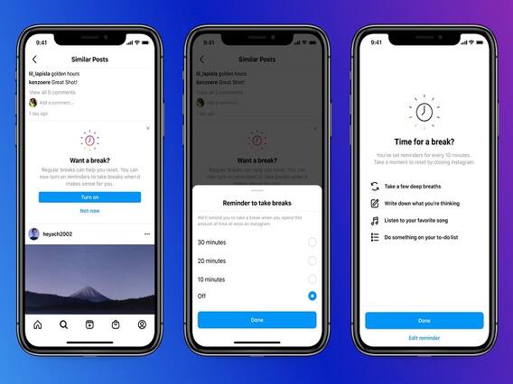 यूजर्स "सेटिंग" में इस फीचर का विकल्प सेलेक्ट किया जा सकता है. इसमें ऑप्शन है कि क्या यूजर 10 मिनट, 20 मिनट या 30 मिनट तक प्लेटफॉर्म का इस्तेमाल करने के बाद उसे बंद करना चाहते हैं. इसके लिए उन्हें एक फुल-स्क्रीन अलर्ट मिलेगा, जो उन्हें एप को बंद करने के लिए कहेगा. इसमें यह सुझाव दिया जाएगा कि आप एक गहरी सांस लें, कुछ लिखें, एक टू-डू लिस्ट देखें या फिर कोई गाना सुनें. Instagram ने कुछ महीने पहले सेफ्टी फीचर्स और प्लेटफॉर्म पर जागरूकता फैलाने के लिए नए कैंपेन्स का ऐलान भी किया था.