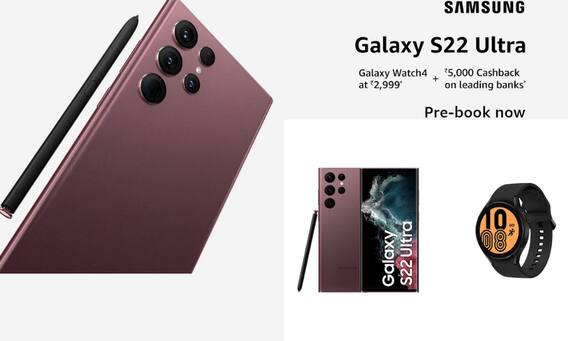 एमेजॉन पर बहुत तेजी से Samsung Galaxy S22 Ultra 5G की बुकिंग हो गयी है. एडवांस में इस फोन को बुक कराने पर ऑफर्स ही ऑफर्स हैं. इस फोन और Samsung Galaxy Watch4 की दोनों कीमत है 1,61,998 रुपये लेकिन प्री बुक कराने पर 30% के डिस्काउंट के बाद 1,12,999 रुपये में खरीद सकते हैं. प्री बुक कराने पर Samsung Galaxy Watch4 सिर्फ 2,999 रुपये में खरीद सकते हैं जिसकी MRP 28,990 रुपये है. इसको किसी भी बैंक के कार्ड से खरीदने पर 5 हजार रुपये का इंस्टेंट कैशबैक है. साथ ही No Cost EMI का ऑप्शन भी है.