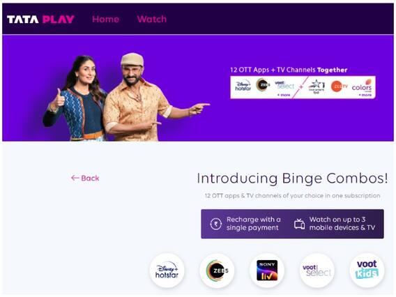 टाटा प्ले कई बिंज कॉम्बो प्लान पेश करता है और यूजर्स यह तय कर सकते हैं कि वे किस कंटेंट के लिए भुगतान करना चाहते हैं ताकि वे उन ऐप्स के लिए भुगतान न करें जिनका वे यूज नहीं कर सकते हैं. आपके फोन के प्रीपेड रीचार्ज प्लान की तरह ही अलग अलग Binge Combo प्लान मंथली रीचार्ज के रूप में उपलब्ध हैं.