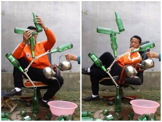 फिलहाल इस दौरान वह कई बार इसमें फेल भी होता है और बेतलें गिर कर टूट भी जाती हैं. अंत में शख्स वह इस टास्क को पूरा कर लेता है और हैरतअंगेज अंदाज में कांच की बोतलें एक दूसरे पर बैलेंस भी कर जाती है. वहीं इस दौरान एक अन्य शख्स लटक रही केतली में पानी भरते भी दिख रहा है. जो की बोतले से ही लटकी हुई है.