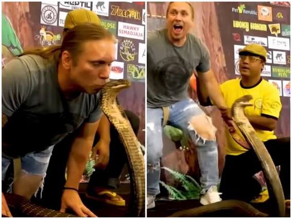 वायरल हो रही क्लिप में एक शख्स को देखा जा रहा है, जो कि जहरीले किंग कोबरा सांप के माथे को चूमने की कोशिश करते देखा जा रहा है. इस दौरान सांप के हिलते ही वह शख्स पीछे की ओर हट जाता है. फिलहाल इसके बाद वह शख्स एक बार फिर से आगे बढ़ता है और धीरे से किंग कोबरा के सिर को पीछे की तरफ से किस करने में कामयाब हो जाता है.
