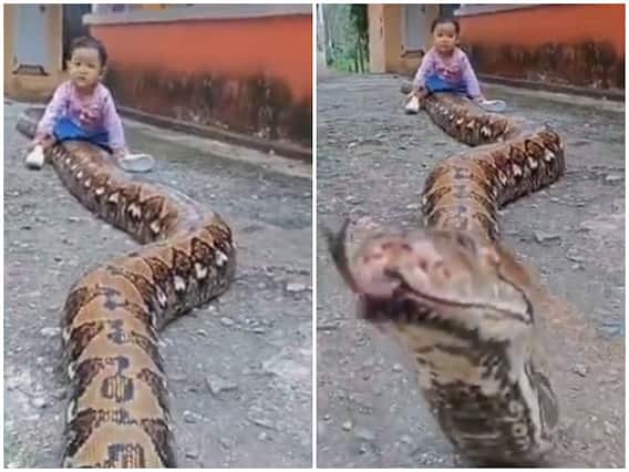 दरअसल, सोशल मीडिया पर सामने आई वीडियो में एक छोटा सा बच्चा बेखौफ होकर एक विशालकाय अजगर के ऊपर बैठे दिखाई दे रहा है. पहली नजर में देख यूजर्स को लग सकता है कि अजगर जैसे दिखने वाले किसी खिलौने से बच्चा खेल रहा होगा, लेकिन वीडियो में अजगर को अपना मुंह खोलते और रेंग कर आगे बढ़ता देखा यूजर्स की रूह कांपते नजर आ रही है.