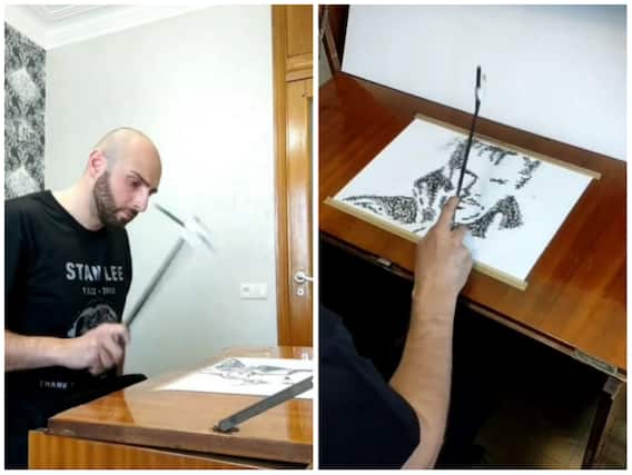 वायरल हो रही वीडियो में एक शख्स टेबल के सामने बैठा दिख रहा है, जिसके सामने एक सादे पेज पर रखी एक लंबी स्टिक पर पेंसिल को बंधा देखा जा रहा है. वीडियो में आगे देखा जा सकता है कि वह शख्स लंबी स्टिक को उठाकर पेपर पर हथौड़े की तरह मारते हुए एक अनोखा पोट्रेट बना देता है. दरअसल स्टिक के आगे लगी पेंसिल से जैसे-जैसे पेपर पर मारा जा रहा है तो उससे एक-एक बिंदू बनता जा रहा है. जिससे अंत में एक बेहतरीन पोर्ट्रेट बनता नजर आ रहा है.