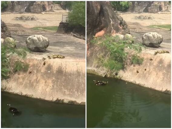 इसी दौरान उसके एक छोटे बच्चे ने भी छलांग दी, जिसे बचाने के लिए अंत में मां को पानी में उतरते देखा जा रहा है, जिसके बाद उसके बच्चे भी बिना किसी डर के एक-एक करके पानी में उतरते नजर आ रहे हैं. वायरल हो रही क्लिप को देख यूजर्स काफी हैरानी भरी नजरों से इस घटना को होते देख रहे हैं. वहीं जिस दौरान यह घटना हुई चिड़ियाघर में मौजूद दर्शकों को पक्षी के बच्चों को चीयर करते देखा गया.