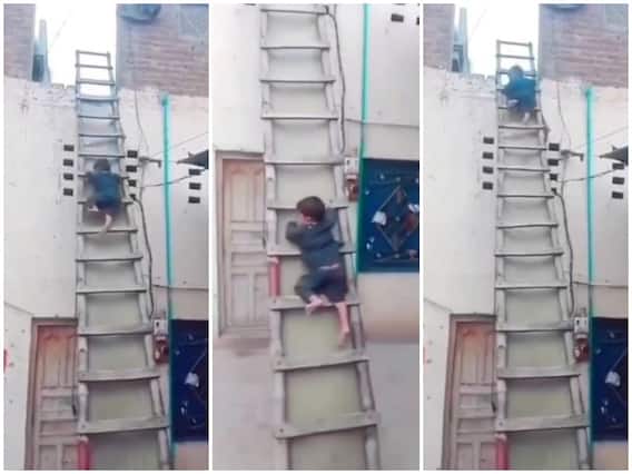 वीडियो में आप देख सकते हैं कि एक छोटा सा बच्चा छत से उतरने के लिए सीढ़ी का सहारा लेता है और नीचे खड़े घरवाले उसका वीडियो बना रहे हैं. बच्चा का जरा से पैर फिसलता है और वो सीढ़ी के सराहे फिसलता हुए नीचे जमीन पर लैंड करता है. जमीन पर आते है वो चलने लगता है और एक महिला उसके पास आती है. हालांकि देखने में लग रहा है कि जैसे बच्चा कोई स्टंट कर रहा हो.