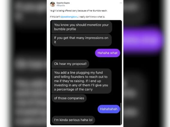 Dating App Bumble: बेंगलुरु की एक महिला को बम्बल पर उसके डेटिंग अकाउंट की बदौलत एक अनोखा बिजनेस प्रपोजल मिला. महिला, जिसे एक्स पर ईप्सिता गुप्ता नाम से जाना जाता है, ने साझा किया कि कैसे उसे अपने बम्बल अकाउंट के कारण एक असामान्य प्रस्ताव मिला. बम्बल यूजर्स ईप्सिटा ने एक्स पर एक स्क्रीनशॉट साझा किया, जिसमें उसकी प्रोफ़ाइल के कारण एक निवेशक की रुचि दिखाई दे रही है. निवेशक ने सुझाव दिया कि वह अपनी लोकप्रिय बम्बल प्रोफ़ाइल का लाभ उठा सकती है. शरुआत में ईप्सिटा ने इसे खारिज कर दिया, लेकिन बातचीत ने जल्द ही निर्णय बदलने पर मजबूर कर दिया.