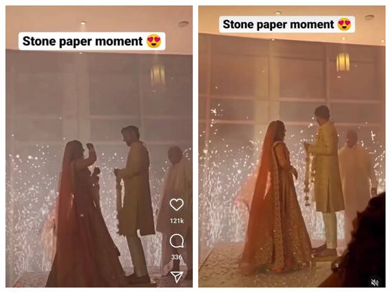 इंस्टाग्राम पर वायरल हो रहे इस दिलचस्प वीडियो (Instagram Video) में आप देखेंगे कि एक भारतीय दूल्हा और दुल्हन को बच्चों की तरह मंच पर ये तय करते है कि जयमाला समारोह के दौरान सबसे पहले कौन वरमाला पहनाएगा. नारंगी लहंगे में दुल्हन खूबसूरत लग रही थी जबकि दूल्हे ने बेज रंग की शेरवानी पहन रखी थी. वो मंच पर ये डिसाइड करने के लिए "Stone, Paper, Scissors" खेल का सहारा लेते हैं ताकि पहले कौन वरमाला पहनाएगा इसका निर्णय लिया जा सके.