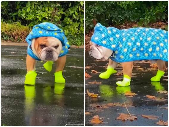 इंस्टाग्राम पर शेयर किए गए इस वीडियो (Instagram Video) में आप एक बुलडॉग (Bulldog) को देखेंगे जो बारिश में सड़क पर घूम रहा है. ये नीले रंग का शर्ट स्टाइल का एक रेनकोट पहने रहता है साथ ही पीले रंग के छोटे-छोटे बूट्स भी पैरों में इसने पहन रखे हैं जो देखने में बेहद क्यूट लगते हैं. बारिश में इसकी चाल भी बहुत निराली लग रही है.