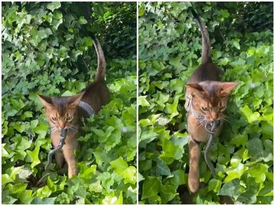 वीडियो में बिल्ली को घर के बैकयार्ड में बने पार्क में उगी झाड़ से निकलते देखा जा रहा है, जिस दौरान उसके मुंह से एक खौफनाक जहरीला सांप लटका दिखाई दे रहा है. वीडियो देख लग रहा है कि सांप को देखकर ही बिल्ली उस झाड़ में गई होगी और उसका शिकार कर वापस लौटी है. बिल्ली के चेहरे पर किसी लड़ाई को जीतने वाले एक्सप्रेशन साफ दिख रहे हैं.