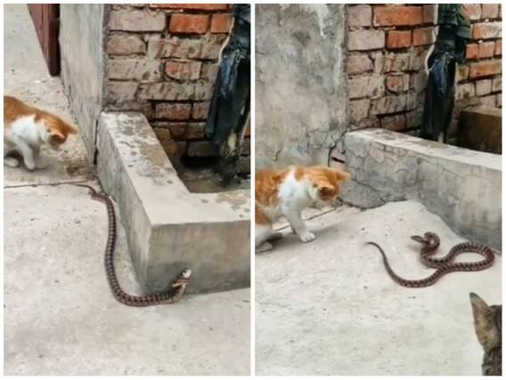 Snake Viral Video: सांप (Snake) इंसानी बस्तियों के आस-पास और जंगलों में पाए जाते हैं, जिनके जहर की एक बूंद भी किसी इंसान की जान लेने के लिए काफी होती है. ऐसे में कोई भी शख्स या फिर जानवर सांप से आमना-सामना करने की हिम्मत नहीं जुटा पाता है. फिलहाल नेवले (Mongoose) और बिल्लियां (Cat) सांप का शिकार करते देखी गई हैं.