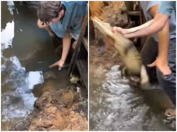 वायरल हो रहे इस वीडियो में एक युवक को फिशिंग के दौरान नदी के अंदर से निकले मगरमच्छ के बच्चे को पकड़ते देखा जा रहा है. आमतौर पर मगरमच्छ पानी के अंदर एक खुंखार जीव माना जाता है, जो कि अपने जबड़े की ताकत से बड़े से बड़े जानवर के शरीर को चीर-फाड़कर खा जाता है. ऐसे में यह युवक मगरमच्छ के बच्चे को पकड़ने की कोशिश करते नजर आ रहा है.