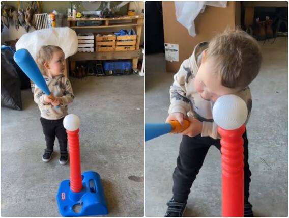 वीडियो में बच्चे के खेलने का अंदाज देख हर किसी के चेहरे पर हंसी खिल गई है. दरअसल, वीडियो में बच्चा अपने हाथ में बेसबॉल बैट लिए नजर आ रहा है. जो की प्लास्टिक के एक रॉड पर रखी गेंद को हिट करने की तैयारी में दिख रहा है. तभी उसका पिता उसे इस गेम की कुछ बारीकियां बताता है. जिस पर बच्चा उसे ठीक से नहीं समझ पाता और पिता के कही बातों को ही फॉलो कर एक शॉट खेलता है.