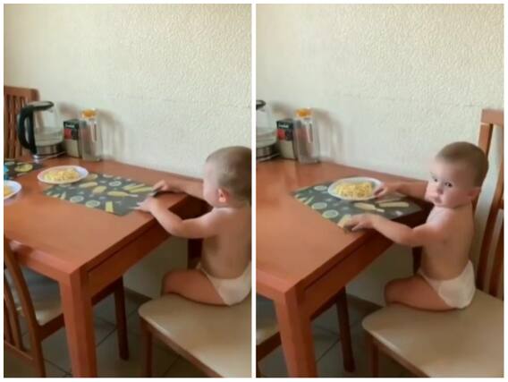 वायरल हो रहे इस वीडियो में छोटे बच्चे को खाने की टेबल के पास बैठे देखा जा रहा है. इस दौरान वह अपनी भूख को काबू में नहीं कर पाता है और उसके सामने प्लेट में रखे खाने को पाने के लिए कोशिश करते देखा जा रहा है.इस दौरान वह बच्चा एक गत्ते की मदद से प्लेट को अपनी ओर खींचने का जुगाड़ सेट करते देखा जा रहा है. जिसे देख हर कोई हैरान हो रहा है.
