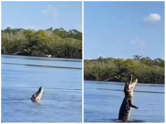 फिलहाल वायरल (Viral Video) हो रही वीडियो में मगरमच्छ (Crocodile) का डरावन रूप उस वक्त देखा जा रहा है, जब वह ड्रोन (Drone) पर हमला करने के लिए पानी से सीधे ऊपर की ओर काफी ऊंचाई तक छलांग लेता है. इसे देख यूजर्स हैरत में पड़ गए हैं वहीं खबर लिखे जाने तक वीडियो को सोशल मीडिया (Social Media) पर 4.5 लाख से ज्यादा व्यूज मिल गए हैं.