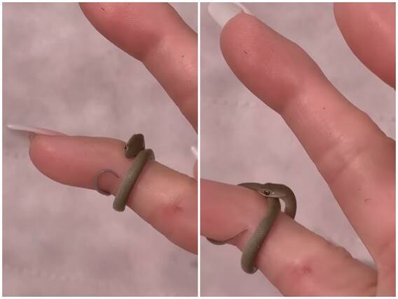 सोशल मीडिया पर वायरल हो रही एक क्लिप में एक महिला के हाथ की अंगुलियों पर सांप के बहुत ही छोटे से बच्चे को कुंडली मारते देखा जा रहा है. महिला इसे अपनी रिंग फिंगर में लपेटते दिख रही है. जिसके साथ ही वह कह रही है कि यह बिल्कुल स्नेक रिंग के जैसा है. वीडियो में सांप के बच्चे को अपना मुंह खोलते देखा जा सकता है. जो की काफी डरावना अनुभव हो सकता है.