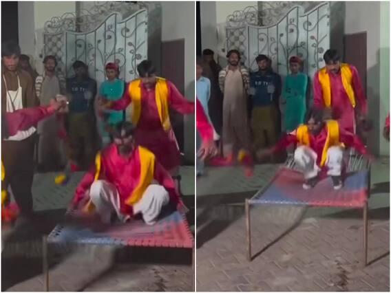 Trending Bhangda Dance Video: सोशल मीडिया पर आए दिन कई डांस वीडियो वायरल होते हैं. शादी का सीजन चल रहा है, ऐसे में कई शादी के वीडियो सामने आने लगे हैं. इन दिनों खटिया डांस का एक वीडियो जमकर वायरल हो रहा है, जिसके मजेदार स्टेप ने यूजर्स को लोटपोट कर दिया है. नागिन डांस और गुटखा डांस के बाद ये बिलकुल अनोखा और फनी डांस फॉर्म है जो नया-नया मार्केट में लॉन्च हुआ मालूम पड़ रहा है. इस वीडियो में स्टेज पर कुछ डांसर के साथ एक अन्य डांसर को खटिया पर बैठकर नाचते हुए कैप्चर किया गया है जो लोगों को काफी मजेदार लग रहा है.