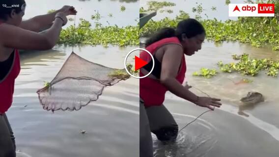 दरअसल, सोशल मीडिया पर वायरल हो रहे वीडियो में एक महिला तालाब में खड़ी है और उसकी पूरी तैयारी तालाब में तैर रही मछलियों को पकड़ने की है. महिला हाथ में जाल लेती है और उसे फैलाकर जैसे ही पानी में फेंकती है वैसे ही उसके साथ कांड हो जाता है. पानी में बेफिक्र होकर महिला जैसे ही जाल फेंकती है वैसे ही तालाब के पानी में महिला के पास ही छिपा आदमखोर दरिंदा यानी मगरमच्छ अपना मुंह बाहर निकाल लेता है और फिर जो होता है उसे देखकर लोग हंस भी रहे हैं और डर भी रहे हैं.