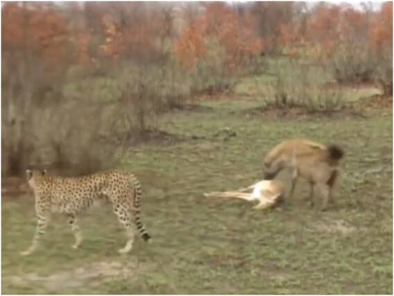 वायरल हो रहे वीडियो को सोशल मीडिया पर @TheFigen_ नाम के ऑफिशियल ट्विटर अकाउंट से पोस्ट किया गया है. इस वीडियो में एक चीता जंगल के अंदर हिरण को दबोचने के बाद उसे खाने की तैयारी में नजर आता है. जिस दौरान वहां पर चीते से ज्यादा ताकतवर लकड़बग्घा आ जाता है और चीते को डराकर भगाने के बाद हिरण को खाने की कोशिश करता है. जिसके बाद लकड़बग्घा अपने सामने खड़े चीते को देख गुस्से से लाल हो जाता है.