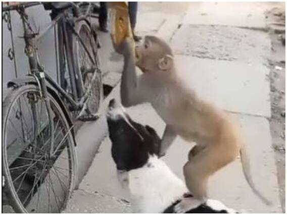 सोशल मीडिया पर कई बार ऐसे वीडियो भी सामने आते हैं जो लोगों का काफी मनोरंजन करते हैं. इनमें कुछ वीडियो काफी मजेदार और फनी भी होते हैं तो कुछ वीडियो हमारी कल्पना से परे होते हैं. अब एक ऐसा ही वीडियो सोशल मीडिया पर सामने आया है. इस वीडियो में एक कुत्ते और बंदर की दोस्ती देखी जा सकती है.