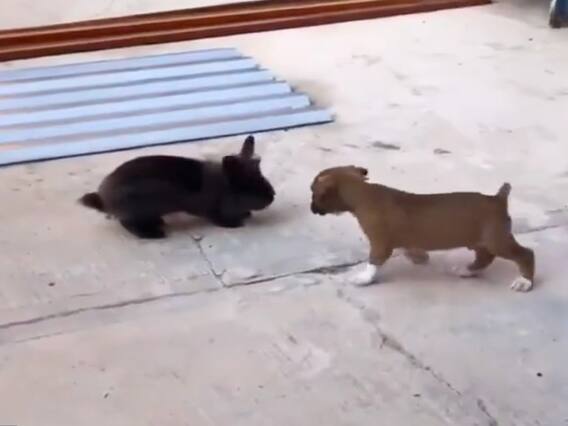 खुद को खरगोश समझने लगा पप्पीसोशल मीडिया पर वायरल वीडियो में एक पप्पी और काले रंग का खरगोश नजर आता है. खरगोश पहले तो नन्हे डॉगी के साथ रहता है फिर अचानक से आगे बढ़ जाता है. खरगोश अपनी चाल में कूदते हुए आगे बढ़ता है. लेकिन क्यूट पप्पी को लगता है कि वो भी खरगोश है और उसे भी कूदते हुए आगे बढ़ना है. डॉगी खरगोश की कॉपी करने लगता है. जैसे-जैसे खरगोश कूदते हुए आगे बढ़ता है वैसे-वैसे डॉगी भी कूदते हुए आगे बढ़ने लगता है. दोनों साथ में बहुत ज्यादा क्यूट लग रहे हैं.