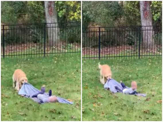 वीडियो को इंस्टाग्राम पर ladbible नाम के पेज पर शेयर किया गया है. जिसमें गोल्डन रिट्रीवर डॉग अपने मुंह में चादर के एक हिस्से को पकड़कर खींचते हुए पीछे की ओर जाता है. और झटके देते हुए बच्चे को चादर से बाहर कर देता है. अंत में बच्चे के चादर से बाहर होते ही वह उसे अपने साथ लेकर चला जाता है.