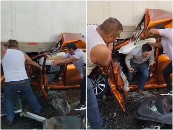 वायरल हो रहे एक वीडियो में हम एक सड़क हादसे को देख सकते हैं. जिसमें एक कार को पीछे से जोरदार टक्कर लगने के कारण वह अपने आगे खड़े ट्रक के नीचे घुस जाती है. जिसके बाद कार के परखच्चे उड़ जाते हैं. उसी समय लोग तेजी से कार के दरवाजे को उखाड़कर ड्राइवर की जान बचाते नजर आते हैं. वीडियो में देखा जा सकता है कि कार का दरवाजा खोलते ही ड्राइवर कार से बाहर निकल जाता है.