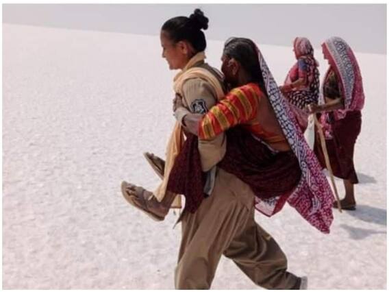 वायरल हो रही तस्वीर में गुजरात की एक महिला पुलिसकर्मी को एक बुजुर्ग महिला को अपनी पीठ पर लेकर जाते देखा जा रहा है. तस्वीर को सोशल मीडिया पर आईएएस अधिकारी अवनीश शरण ने शेयर किया है. जिसे शेयर करने के साथ ही उन्होंने कैप्शन देते हुए लिखा कि 'गुजरात की एक महिला कांस्टेबल वर्षा परमार ने कच्छ में 86 वर्षीय बुजुर्ग को स्वास्थ्य परेशानी होने के कारण पीठ पर उठाया और तपते रण में 5 किलोमीटर चलकर सुरक्षित स्थान तक पहुंचाया.'
