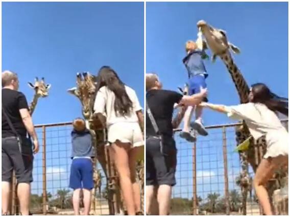 वायरल हो रहे वीडियो में देखा जा सकता है कि एक बच्चा अपने माता पिता के सामने बाड़े में खड़े जिराफ को खिलाने के लिए सामने आता है. जिसके बाद जिराफ बच्चे का दिया खाना, खाने के लिए अपनी गर्दन झुकाता है और उसे अपने मुंह में पकड़ कर तेजी से ऊपर उठाने लगता है. ऐसा होने से पर वह बच्चा हवा में ऊपर की ओर जाने लगता है.
