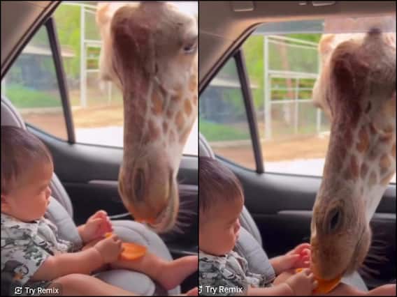 वायरल वीडियो (Viral Video) में एक जिराफ की अनोखी हरकत कैद हो गई है जिसे देख आपका दिल भी सहम जाएगा. वीडियो में आप कार के अंदर एक बेहद छोटे बच्चे को बैठा हुआ देख सकते हैं. बच्चे के हाथ में गाजर है जो वो खा रहा होता है. कार की विंडो के बाहर से ही एक जिराफ की गरदन नजर आ रही होती है. तभी अचनक ये जिराफ अपना मुंह कार के अंदर कर लेता है और इस बच्चे के हाथ से गाजर ले लेता है. मासूम बच्चा भी जानवर को गाजर का टुकड़ा बहुत आराम से दे देता है जैसे मानो वो उसका कोई दोस्त हो. इस वीडियो को देखकर कोई दंग रह जाएगा.