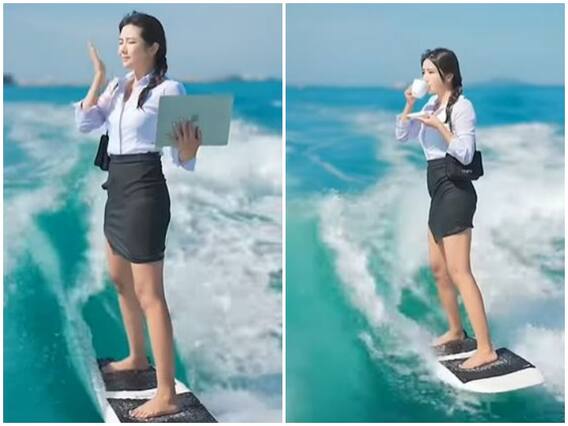 फिलहाल इस बीच कुछ कंटेंट क्रिएटर अपने कंटेंट को सबसे अलग दिखाने के लिए कई तरह के जुगाड़ लगाते दिख रहे हैं. एक युवती की सर्फिंग के दौरान ऐसा ही कुछ क्रिएटिव देखने को मिला है. जिसे देख यूजर्स की आंखें खुली की खुली रह गई है. जिससे सभी को हैरानी भी हो रही है. फिलहाल वीडियो में सर्फिंग कर रही युवती को ऑफिस ड्रेस में देखा जा रहा है.