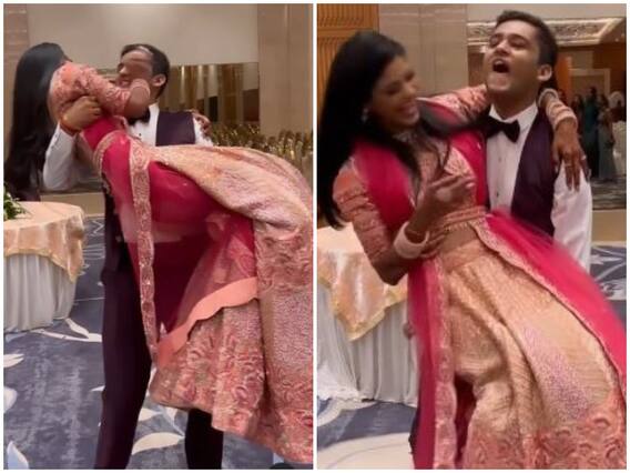 सामने आए वीडियो में आप देख सकते हैं कि दुल्हन काफी भारी लहंगा पहने दिखाई दे रही है. ऐसे में कुछ लोग मस्ती करते हुए दूल्हे को चैलेंज देते हैं कि वो दुल्हन को उठा कर दिखाए. इसपर दूल्हा चैलेंज लेता है और दुल्हन को उठाने की कोशिश करता है लेकिन ठीक से उठा नहीं पाता. इसके बाद दुल्हन कहती है कि वो लहंगे को उठा नहीं पा रही है ऐसे में दूल्हा उसे क्या उठाएगा. हालांकि इसके बाद दूल्हा एक बार फिर से कोशिश करता है और इस बार वो अपनी दुल्हनिया को काफी अच्छे से उठाता है.