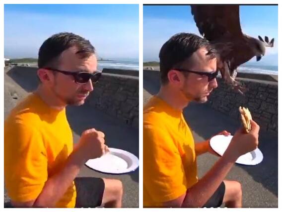 वीडियो में आपने देखा कि नारंगी रंग की टी-शर्ट, काले रंग की शॉर्ट्स और धूप का चश्मा पहने हुए एक आदमी समुद्र तट पर बैठा था और अपने सैंडविच खाने की रिकॉर्डिंग कर रहा था तभी कहीं से एक बाज आया और उसके हाथ से सैंडविच छीन लिया. इस घटना के बाद वह आदमी बेहद निराश दिख रहा था और फिर उसने अपनी गर्दन झुका ली.