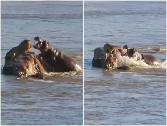 वीडियो में शेर को एक नदी के बीच में एक चट्टान पर फंसा हुआ देखा जा सकता है. जिस दौरान वह खुद को संभालने की कोशिश करता है. उसी समय एक विशालकाय हिप्पो अपने झुंड के साथ आगे बढ़ता है और शेर पर हमला कर देता है. जिस दौरान शेर पत्थर पर चलने लगता है और हिप्पो से दूर जाते हुए अचानक ही नदी में छलांग लगाकर हिप्पो के झुंड से दूर जाने की कोशिश करता है.