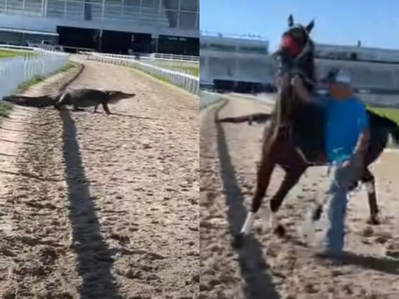 दरअसल, 19 मई को लुइसियाना के विंटन स्थित डेल्टा डाउन्स रेसट्रैक पर घुड़सवारी के माहौल के बीच एक बड़े मगरमच्छ की एंट्री हो जाती है. मगरमच्छ धीरे-धीरे रेसट्रैक पर आगे बढ़ता है, लेकिन उसे देखकर सांसें किसी और की अटक जाती है. मगरमच्छ से कुछ ही दूरी पर एक घुड़सवार घोड़े को लिए खड़ा होता है. घोड़े की नज़र जैसे ही खतरनाक मगरमच्छ पर पड़ी उसकी हालत पतली हो गई.