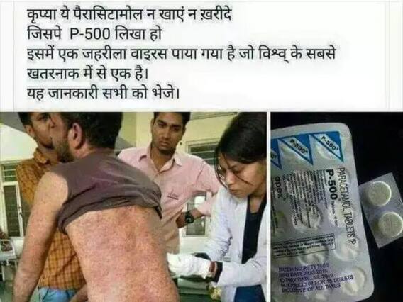 WhatsApp पर एक स्क्रीनशॉट वायरल हो रहा है, जिसमें एक पैरासिटामोल का पत्ता दिख रहा है और उस पर लिखा है PARACETAMOL TABLETS IP और इसके नीचे बोल्ड में लिखा है P-500. पैरासिटामोल के इसी पत्ते के नीचे एक मैसेज लिखा है, जिसमें लिखा है, 'आर्जेंट वार्निंग! आप इस तरह के पैरासिटामोल को लेने से बचें जिसमें P-500 लिखा है. डॉक्टरों का कहना है कि इस सफेद चमकदार पैरासिटामोल में दुनिया के सबसे खतरनाक वायरसों में शामिल Machupo वायरस है. इस वायरस से लोगों की तेजी से मौत होती है. इसलिए सभी लोग इस मैसेज को अपने अपने फैमिली WhatsApp ग्रुप में इसे तेजी से शेयर कर दें. इसके साथ ही नीचे एक भावनात्मक मैसेज भी लिखा है. इसमें लिखा है कि मैंने अपना काम कर दिया अब आपकी बारी. ध्यान रखें जो लोग दूसरों की मदद करते हैं, भगवान उनकी मदद करता है.'' यह कितना हास्यास्पद है कि लोग अब फेक न्यूज फैलाने के लिए भगवान का भी सहारा लेने लगे हैं.