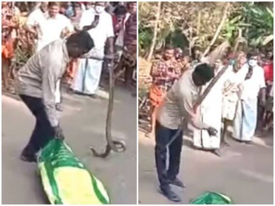 Trending News In Hindi: सबसे जहरीला और खतरनाक सांप कोबरा हमारे देश के दक्षिणी राज्यों में ज्यादातर संख्या में पाया जाता है, ऐसे में इन इलाकों में सांपों के साथ ऐए दिन इंसानों की मुठभेड़ होते देखी गई है. सोशल मीडिया पर भी ऐसे कई वीडियो लगातार सामने आते रहे हैं. जिसे देख यूजर्स के रांगटे खड़े हो जाते हैं. फिलहाल इन दिनों सोशल मीडिया पर एक वीडियो तेजी से वायरल होते दिख रहा है. जिसमें एक शख्स को कोबरा पर काबू पाते समय उसे खोबरा का शिकार बनते देखा जा रहा है.