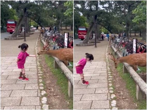 Deer Viral Video: इंटरनेट पर रोजाना हजारों की तादाद में वीडियो सामने आते रहते हैं. जिनमें से कुछ वीडियो यूजर्स के दिलों में अपनी जगह बना लेते हैं. ऐसे वीडियो को यूजर्स लंबे समय तक देखना पसंद करते हैं. हाल ही के दिनों में छोटे और प्यारे बच्चों के वीडियो ने सोशल मीडिया पर यूजर्स को अपनी ओर खींचा है. हाल ही में एक ऐसा ही प्यारा वीडियो सोशल मीडिया पर सामने आया है, जिसमें एक छोटी बच्ची एक जंगली हिरण को खाने के लिए कुछ देती नजर आ रही है.