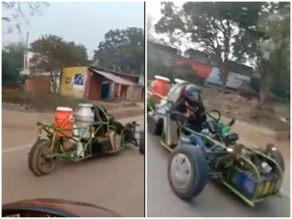वीडियो को एक यूजर ने ट्विटर पर शेयर किया है. जिसके इस वीडियो में एक दूध बेचने वाले शख्स को सड़क पर एक क्रिएटिव गाड़ी पर दूध के बड़े जार ले जाते हुए देखा जा सकता है. बिना हुड के बनाया गया यह वाहन इनोवेटिव थ्री-व्हीलर रेसिंग कार जैसा लग रहा है. फिलहाल वाहन को चलाते समय युवक हेलमेट पहने दिख रहा था.