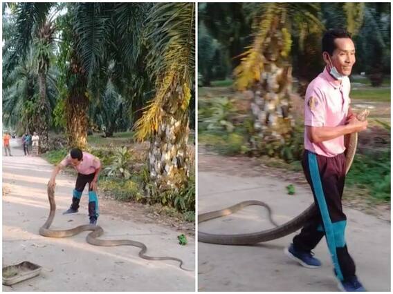 वीडियो को थाईलैंड के एक पार्क का बताया जा रहा है. समाचार वेबसाइट थाइगर के अनुसार बताया गया है कि थाईलैंड के दक्षिणी प्रांत क्राबी में एक ताड़ के बागान में इस विशालकाय सांप को घुसते देखा गया था, जिसकी सूचना स्थानीय लोगों ने प्रशासन को दी थी. जिसके बाद प्रशासन की टीम ने मौके पर पहुंच कर एक सेप्टिक टैंक में छिपने की कोशिश कर रहे इस बड़े से कोबरा सांप को पकड़ कर बाहर निकाल दिया.